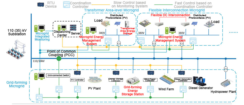 The solution includes transformer area-level microgrids, flexible interconnected microgrids, grid-forming microgrids, and microgrid clusters. The microgrid system integrates distributed power sources, energy storage systems, and intelligent management platforms for real-time regulation of PV plants, wind farms, energy storage, and adjustable loads.